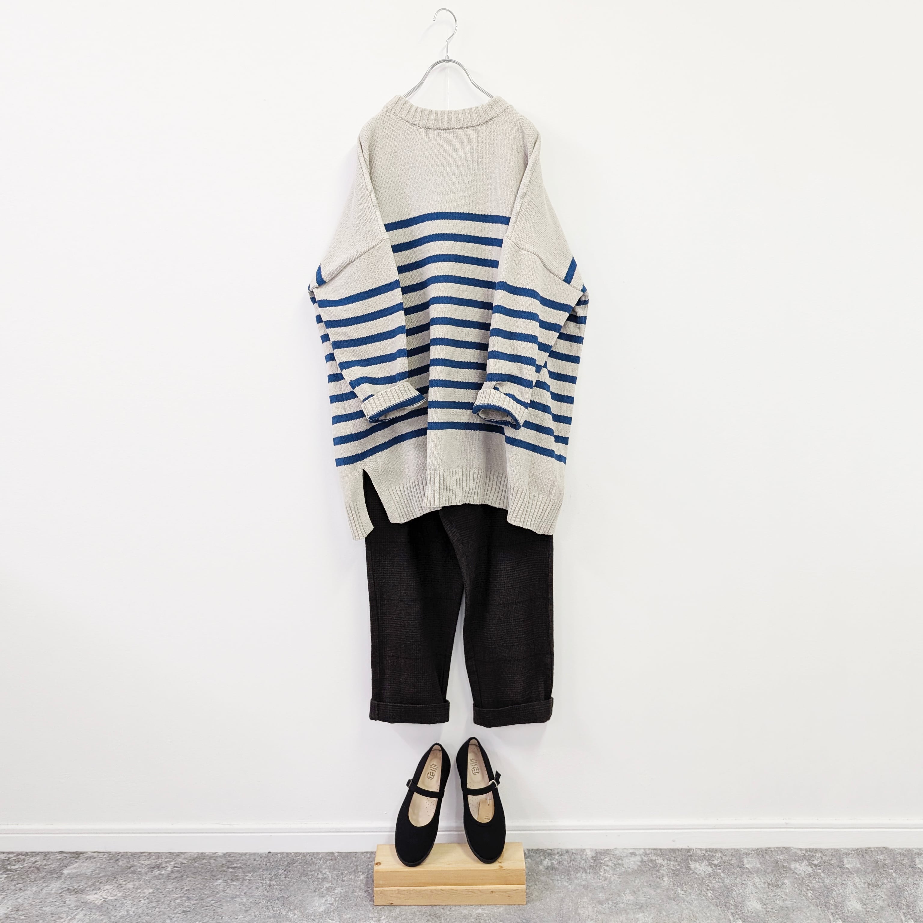 ワイドなニットにおすすめなすっきりテーパードパンツを合わせてバランスよく着こなししていただけます。暗くなりがちな秋冬におすすめなニット。寒さの残る春先までお楽しみただけます。