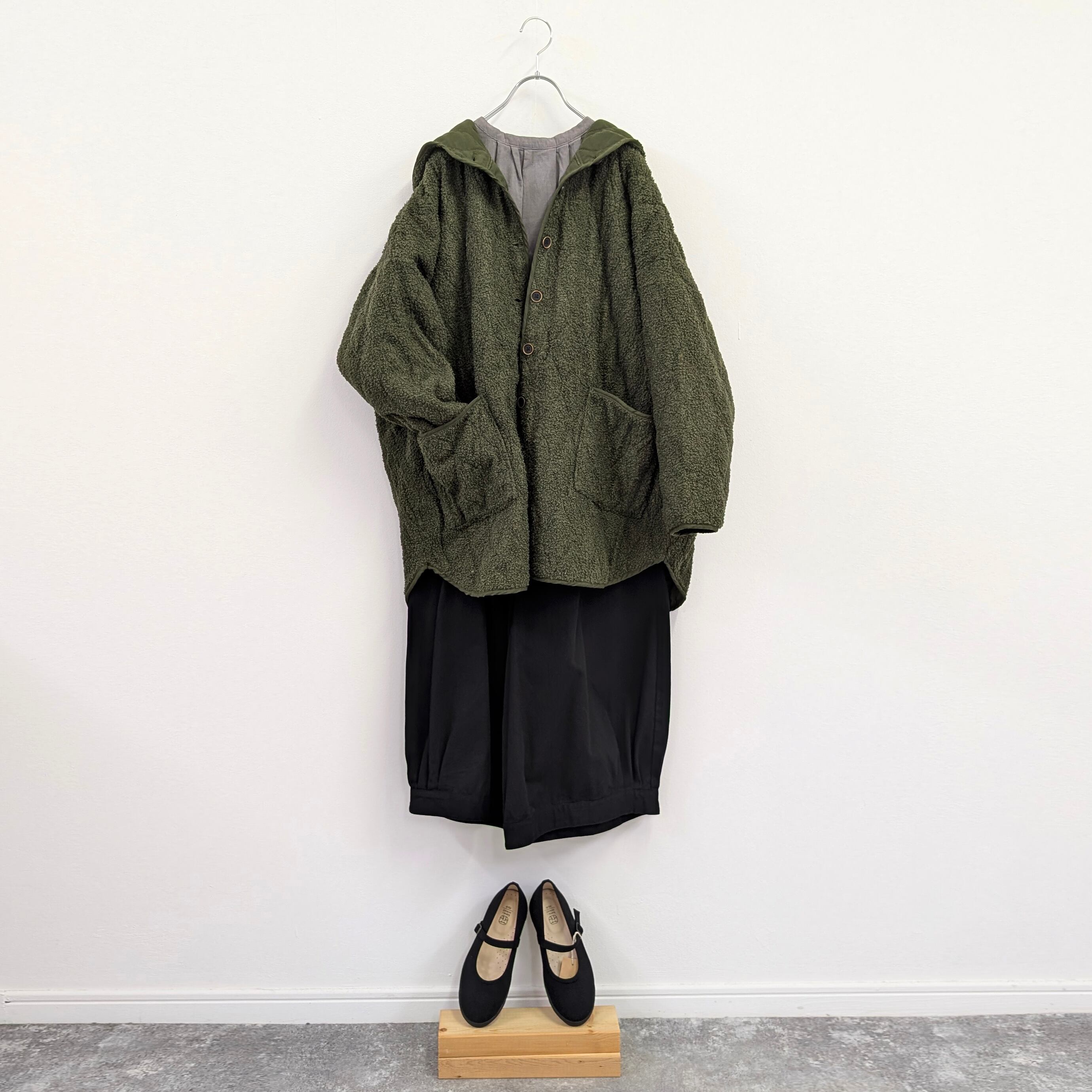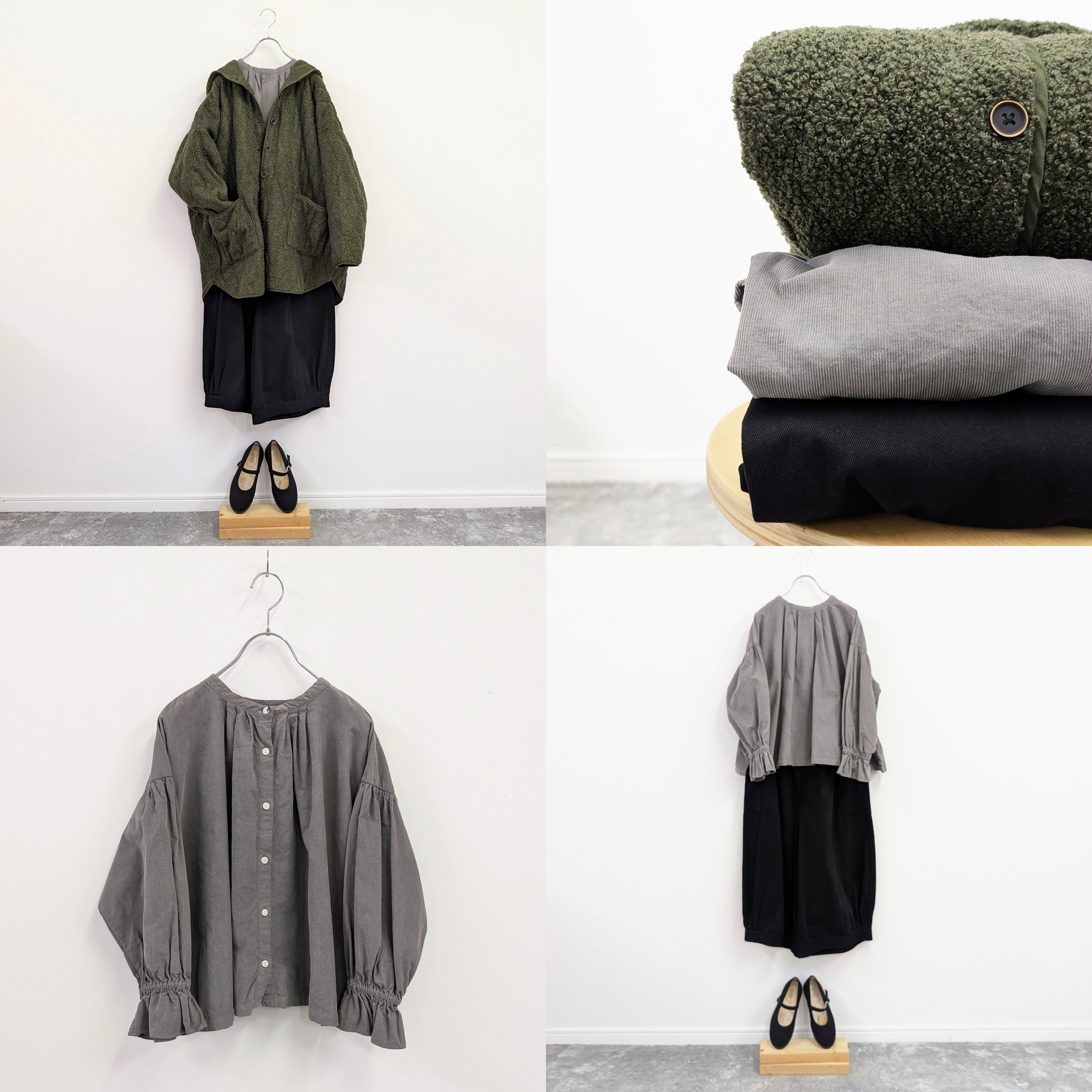 またパンツの裾にタックが入った立体的なコクーンパンツや、ドルマンスリーブのコートなどニュアンスシルエットが揃ったコーデセットです。
